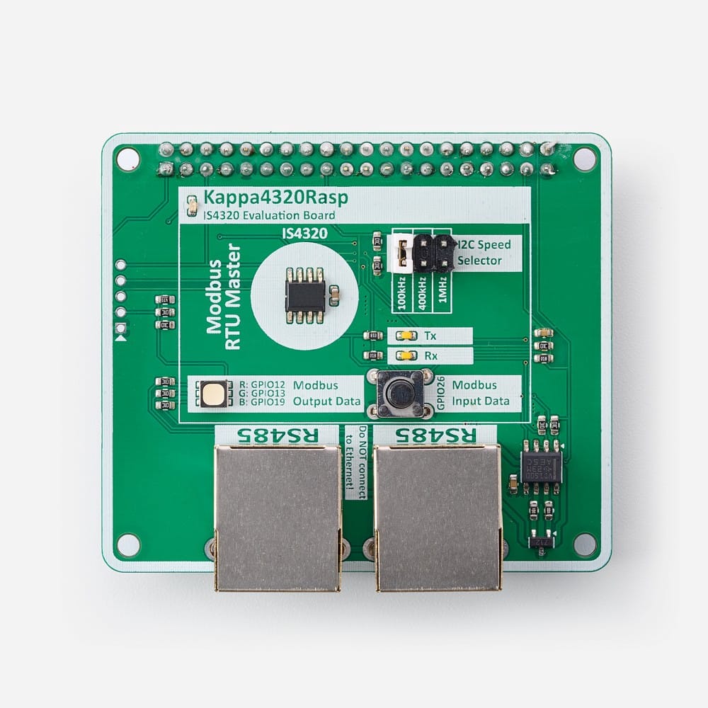 The Kappa4320Rasp is an evaluation board for the IS4320 Modbus RTU Slave chip. It enables engineers to easily evaluate the IS4320 without the need for soldering or developing their own prototype, offering a ready-to-use solution. The board features an RGB LED and a push-button to simulate an actuator and a sensor.