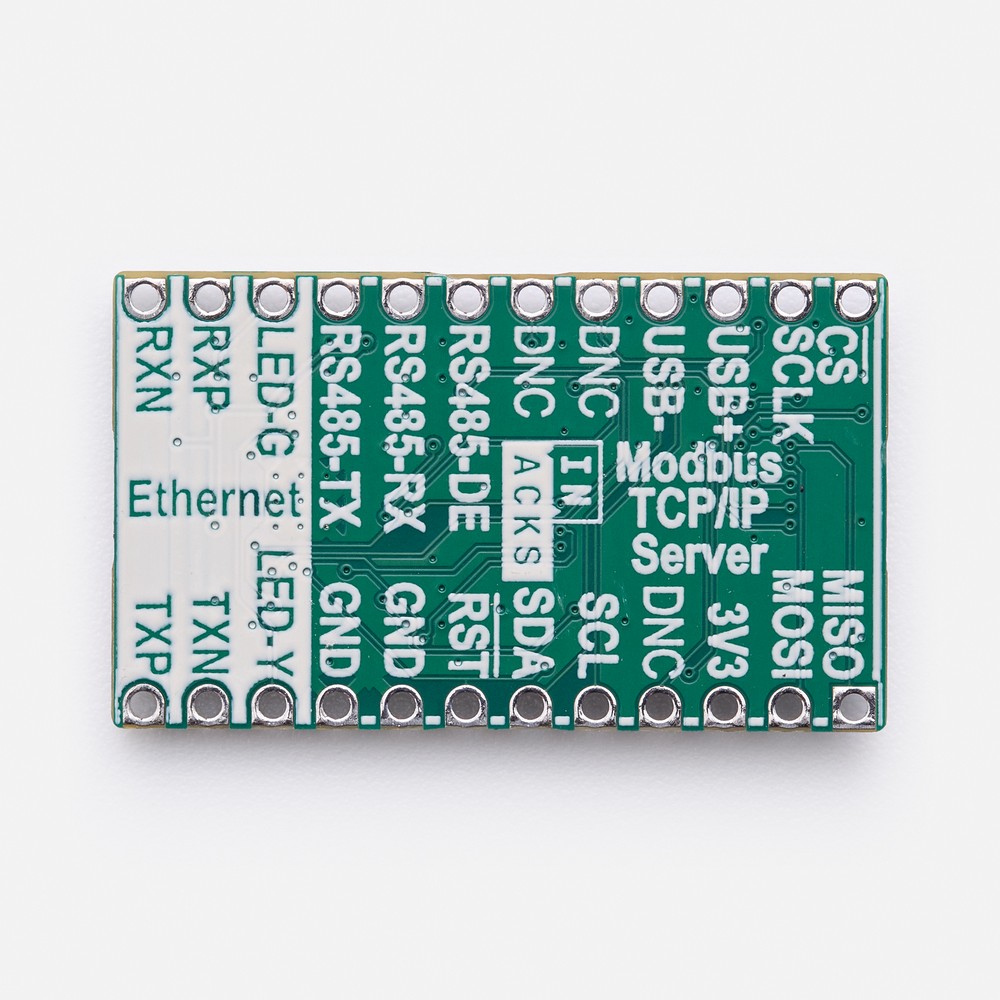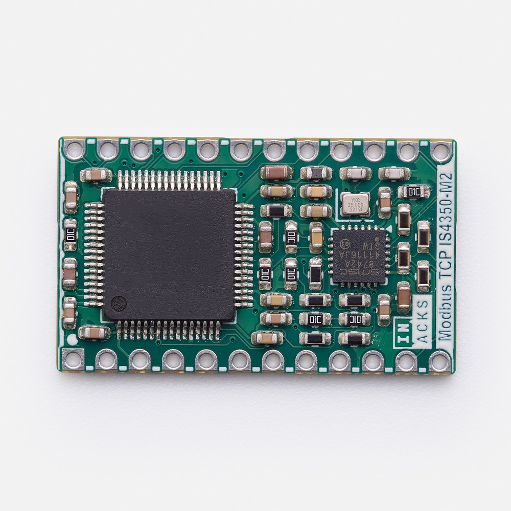 The IS4350-M2 is a module that mounts a chip that integrates a Modbus TCP/IP Slave stack. It features an internal memory of 500 Holding Registers, accessible by both a microcontroller (via I2C) and a Modbus Master device (e.g., PLC, computer, etc.).
