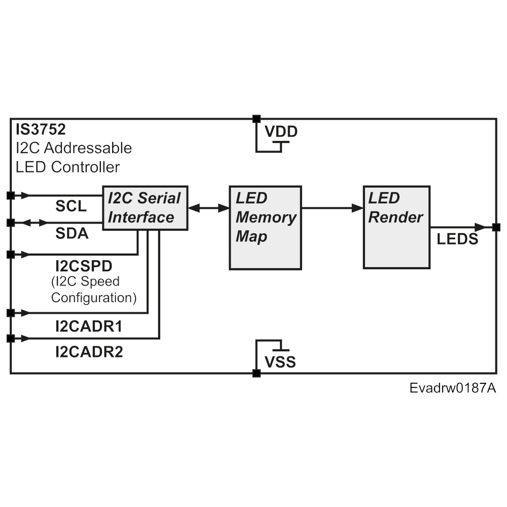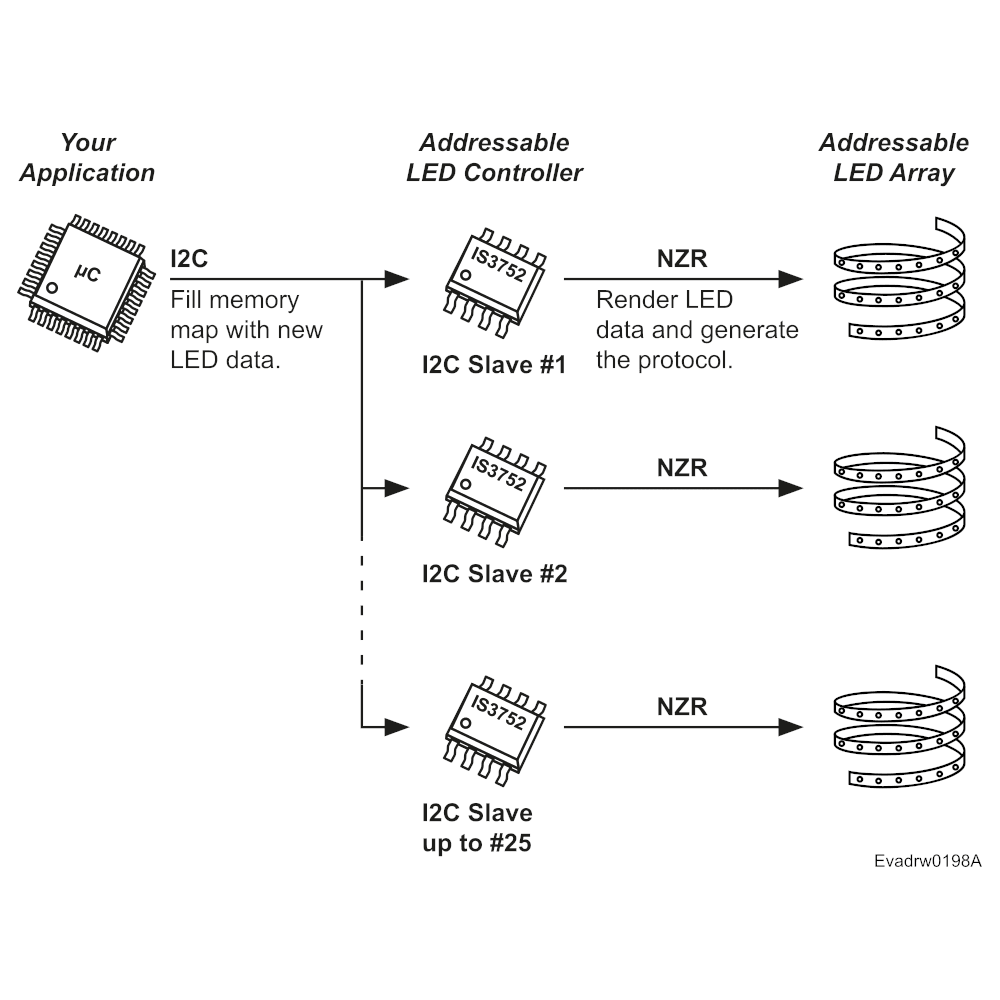 The IS3752 is an addressable LED controller IC accessed via I2C. It supports up to 25 configurable I2C addresses, allowing up to 25x IS3752 devices to operate on the same I2C-serial interface.