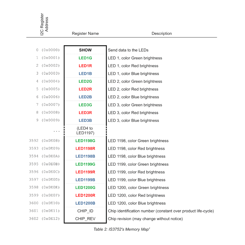 – The IS3750 supports only a single I2C slave address, meaning only one device can be used on the same I²C interface, and therefore only 1,200 LEDs can be controlled.