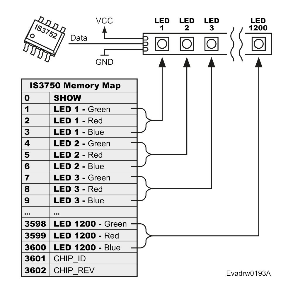 The IS3752 chip is very easy to use. It has been designed to facilitate the integration of addressable LEDs into your project.